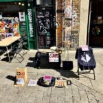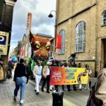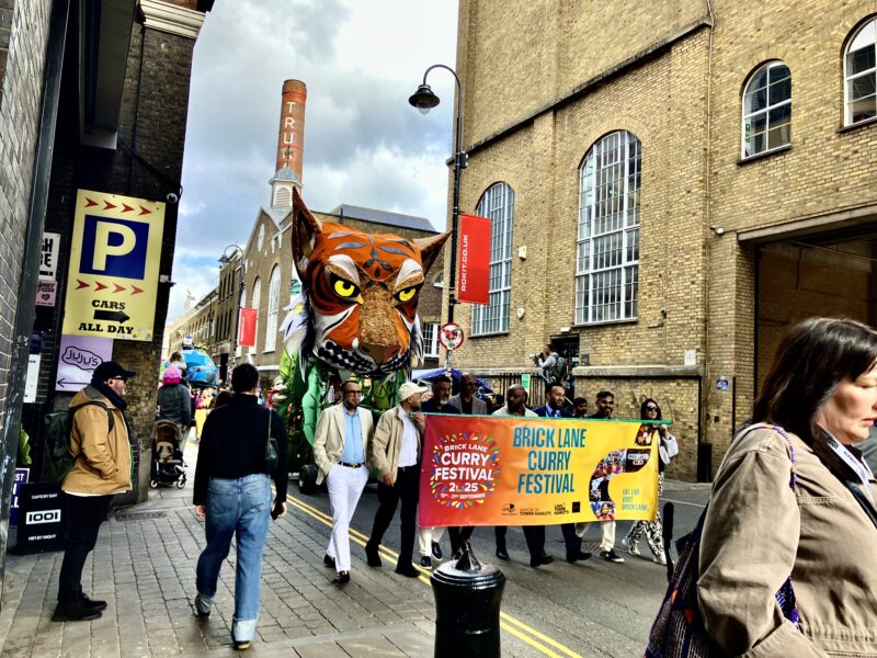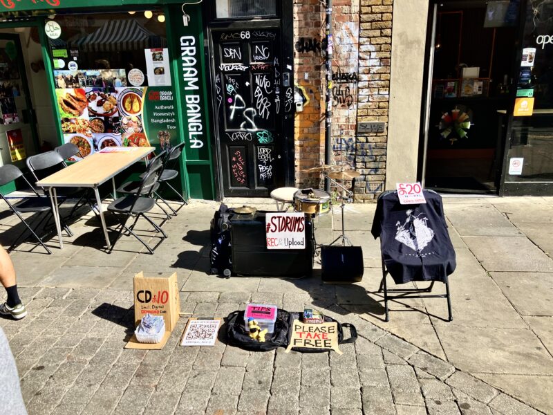起床・即Brick Lane の伝説は続いている。無事メインスポットも押さえて、天気もよく、カレーフェスティバルが開催される今日は期待がある。12時前から軽く演奏をしていると、その主催者?から「ウチの店の前で叩いてくれ」とオファーを受ける。新しいチャンスは引き受けるべきなので、オープニングセレモニーのサウンドシステムが通りかかったあとにAldgate 側に移動。指定の店の前まで行くと「ここでは叩けない」と自治体。もう一発遠くに飛ばされ、総合受付?前辺りにセッティング。今日ストリートの使用権は主催が持っているため、メインスポットを譲る形で実質オフィシャルのバスキングとなった。