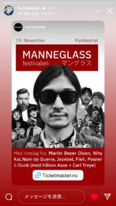 11月19日ノルウェー・オスロにて “MANNEGLASS FES” 遂に発表。ハイハットクラッチから始まった我々の出会いはWhy Kai とのジャパンツアーを経て、とうとう母国ノルウェーでのフェスへと繋がった。FIEH アカウントから自分の顔をシェアされる日が来るとは。
