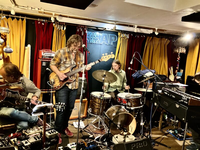 21時前に切り上げてバスで北上、”MAP Studio Cafe” へ到着。MANNEGLASS ファミリー、我々の出会いの拠点Ola を発見。ノルウェーから “NEEDLEPOINTS” のライヴ。開演直前から「なんていうんだっけ?」とギター Bjorn からグラスを指されて言われる。MANNEGLASS。幾多のバンドで活躍する Ola だが、音が始まるとまさかの超プログレ。それも Caravan, Camel 辺りのカンタベリーサウンドの美味しいところが続く濃厚さ。急展開・インタープレー・6/8の哀愁を余すところなく発揮して満腹。Ola のドラムは軽いタッチでありながら細かく鋭い。ノルウェーらしい知性とロックが詰まった1時間。