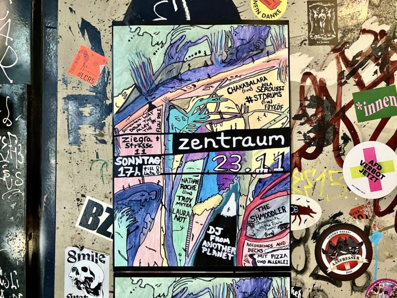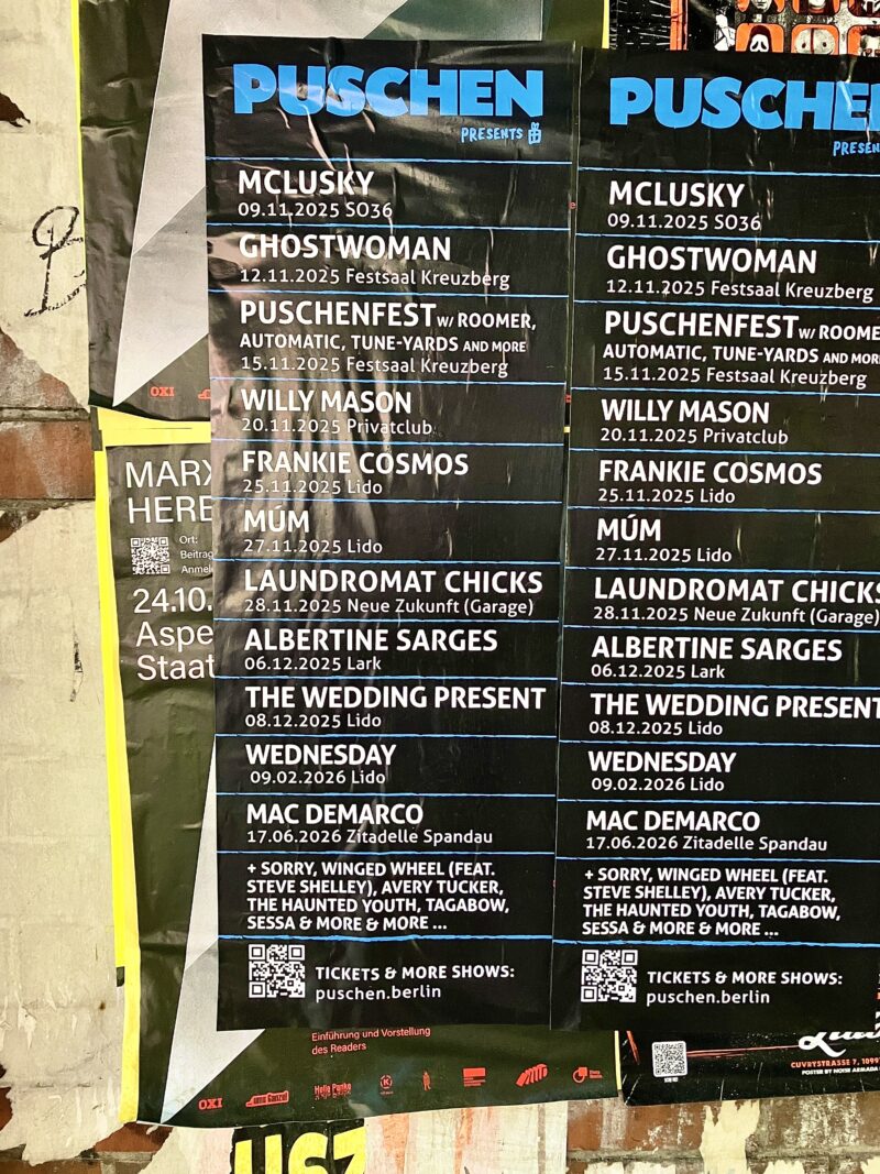うまく寝付けず14時前に家を出る。電車に乗ろうとするとストライキ?が起きており、電車に乗れるのか乗れないのかわからない状態で、隣にいたDJ をやっているという男性と話しながら運よく電車に乗れて1駅。目的地に向かって歩いていると見たことのある字面…タイミングが合わずロンドンで断念した múm のライヴが、まさかのベルリンであるではないか。トンネルに貼られたポスターで見つけるアナログ情報というのもベルリンらしくてよい。