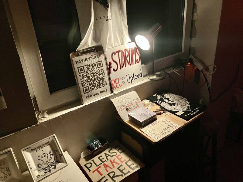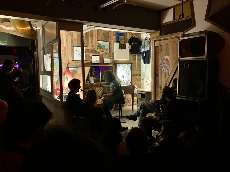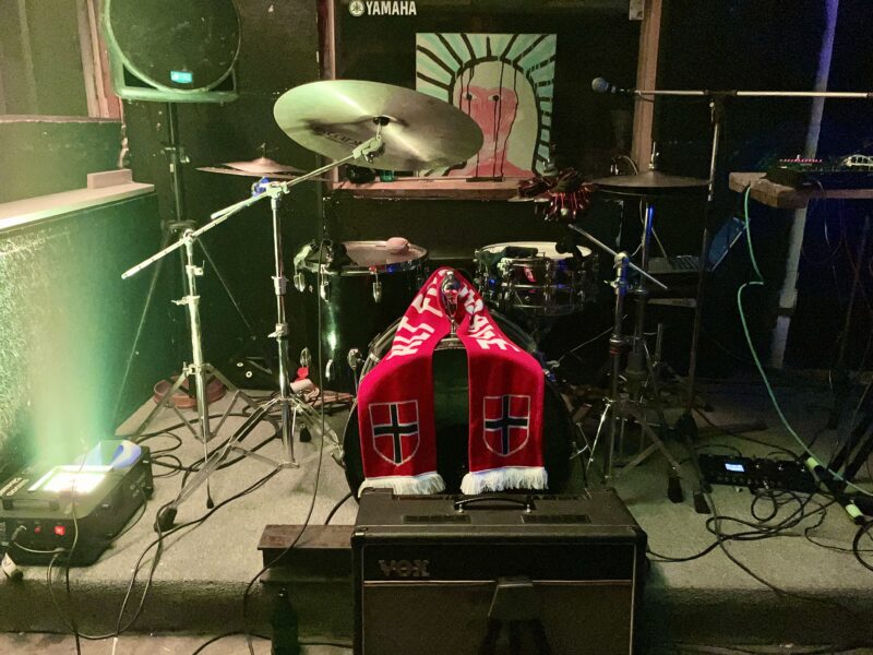 Google Map に出現しないこの場所は口コミとコミュニティーの広がりで支えられている。オーナー?のオムリによるエクスペリメンタルなピアノ弾き語りをじっくり座って聴いたり、タイムテーブルもないような状況で #STDRUMS は23時ごろに出演。Elias がくれたノルウェーサッカーチームのマフラーを添えてのセッティング。場所は変われど我々の魂は生き続けている。Chakanalara とわたしを繋げてくれた友達も来てくれて、会場は #STDRUMS をアットホームに迎え入れてくれた。重しの代わりにアンプを設置したもののキックが動いてしまい、フロアの皆さんに支えてもらって完遂。