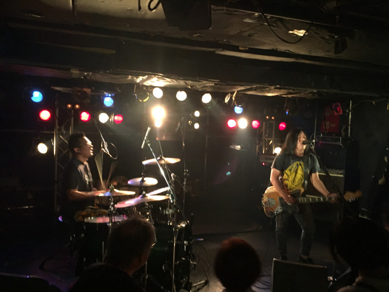 17:06 セッティング。フロア。スーツケースドラム。簡易ステージは使わない。スピーカーとミキサー設営。マイキングはキックのみ。ビーターが破損し、お店のものにダンボールで急遽作成。