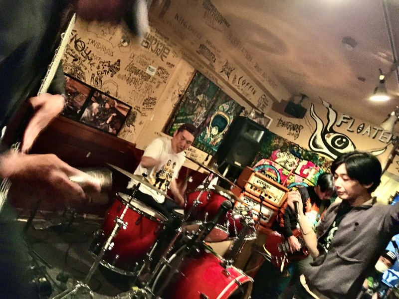 FLOATERS と North By Northwest で大阪・名古屋とツアーした3日目に、昼間から開催してのツアーファイナル。いつ寝てるんだ…?そんな1番手 FLOATERS はグイグイ飲みまくっての演奏。Junさんのロールするタイトなドラミングにタナカさん、ヒロさんの重低音が入り混じる。ドゥームとジャンル付けされているが、ビートからリズムまで実に多様性に富んでいるのは彼らの音楽愛そのもの。じゃなきゃ今日の出演陣は集められない。